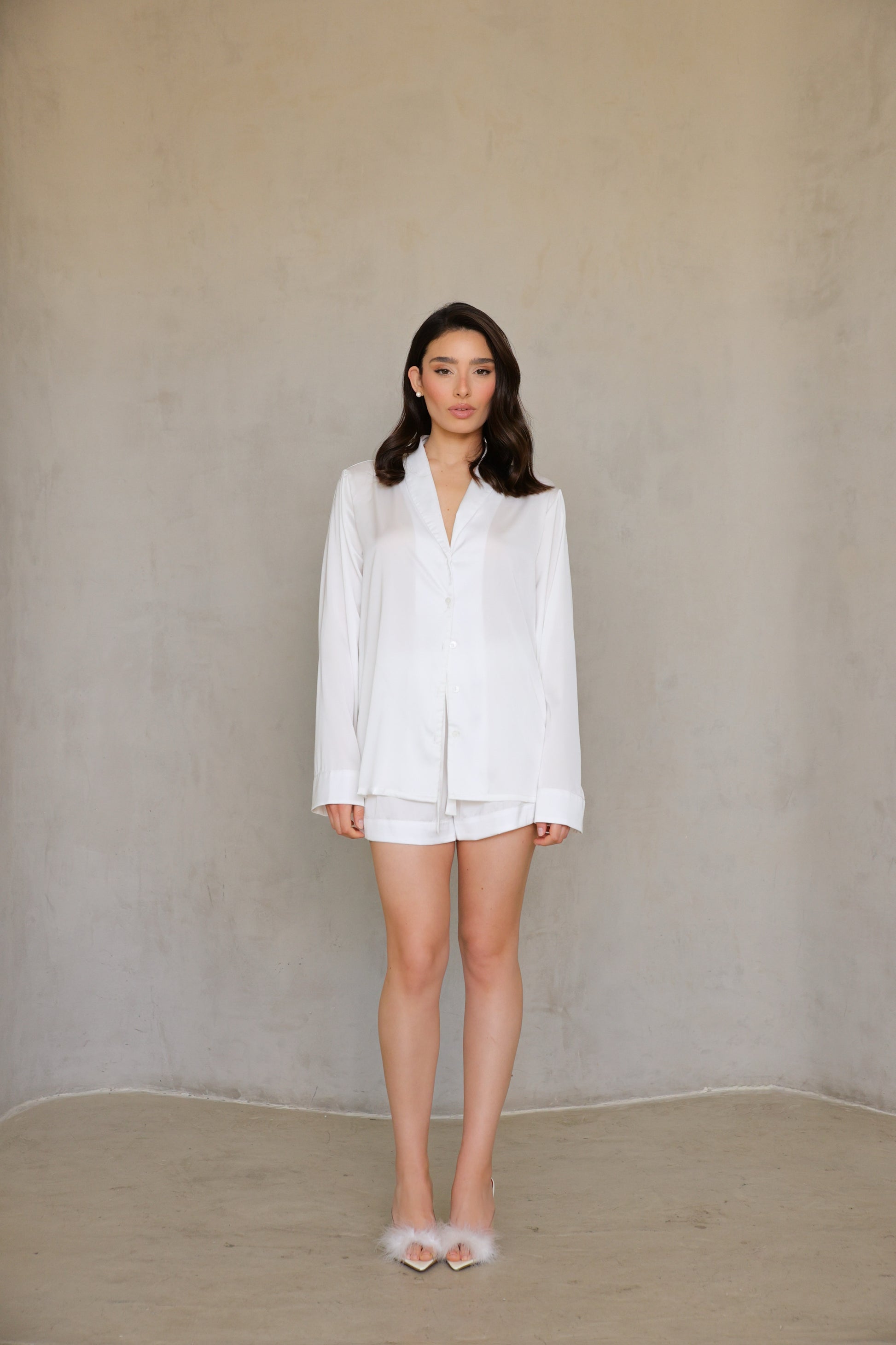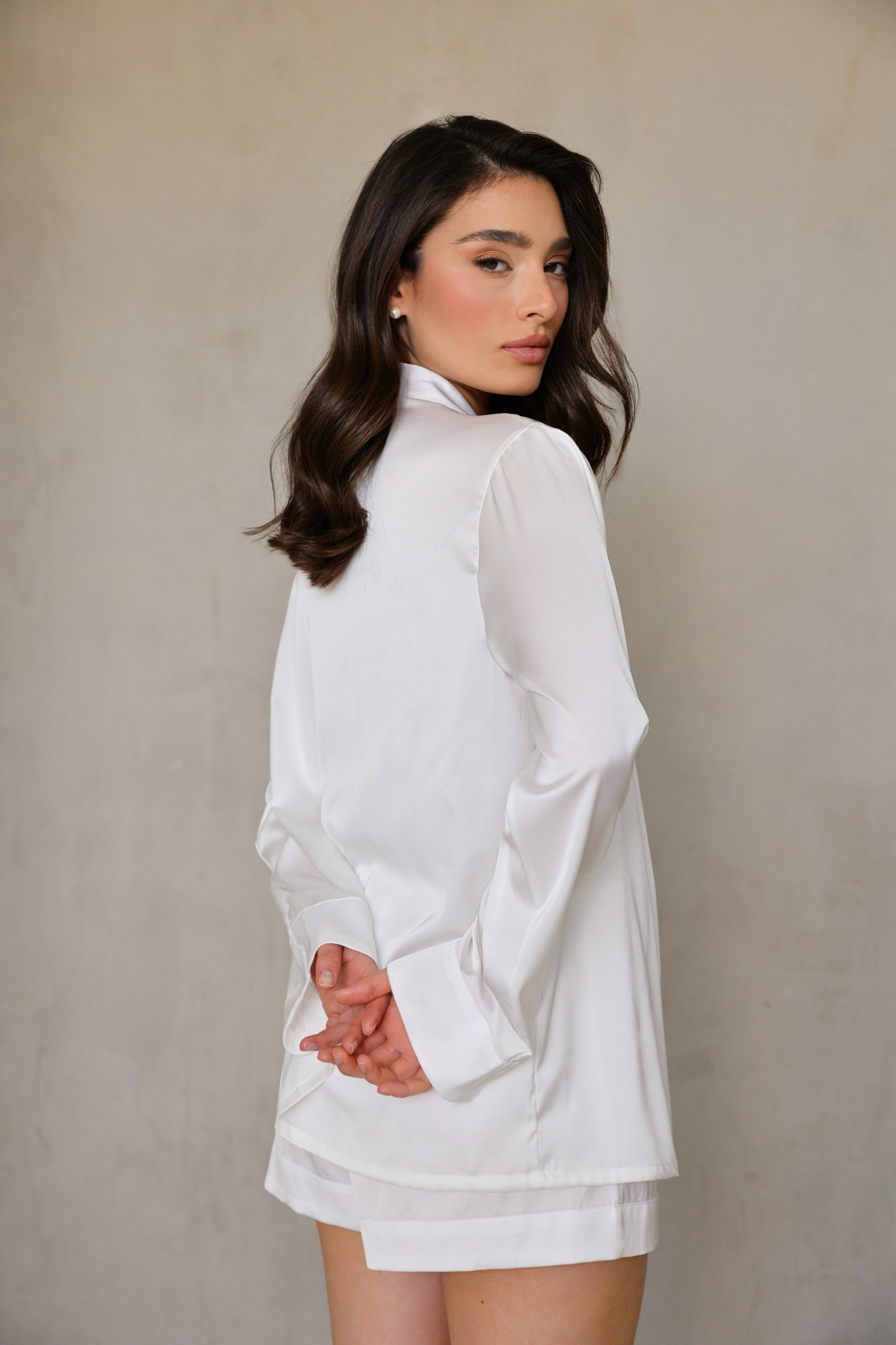 חולצת סאטן סמי-משי לבנה בגזרה ישרה ונשפכת, עם צווארון וינטג’ עגול הנפתח ל-V עדין וסגירת כפתורים - קו נקי וקלאסי שמעניק טאץ’ מלוטש ומוקפד לשלב ההתארגנות.