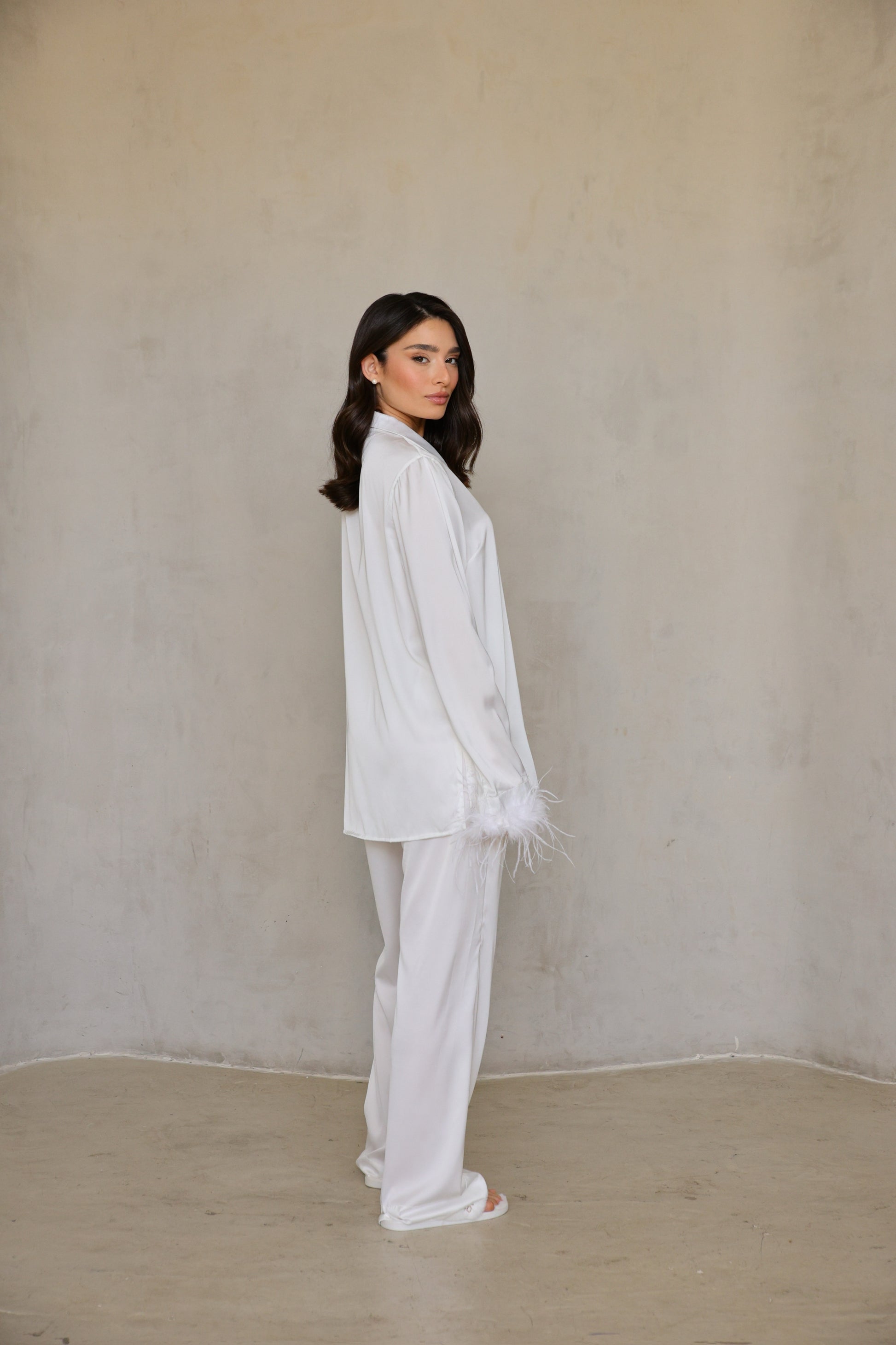 מכנס סאטן סמי-משי לבן בגזרה גבוהה המתרחבת קלות ומתאספת סביב הקרסול, עם מכפלת ארוכה מקופלת שמעניקה תנועה רכה ואלגנטית.