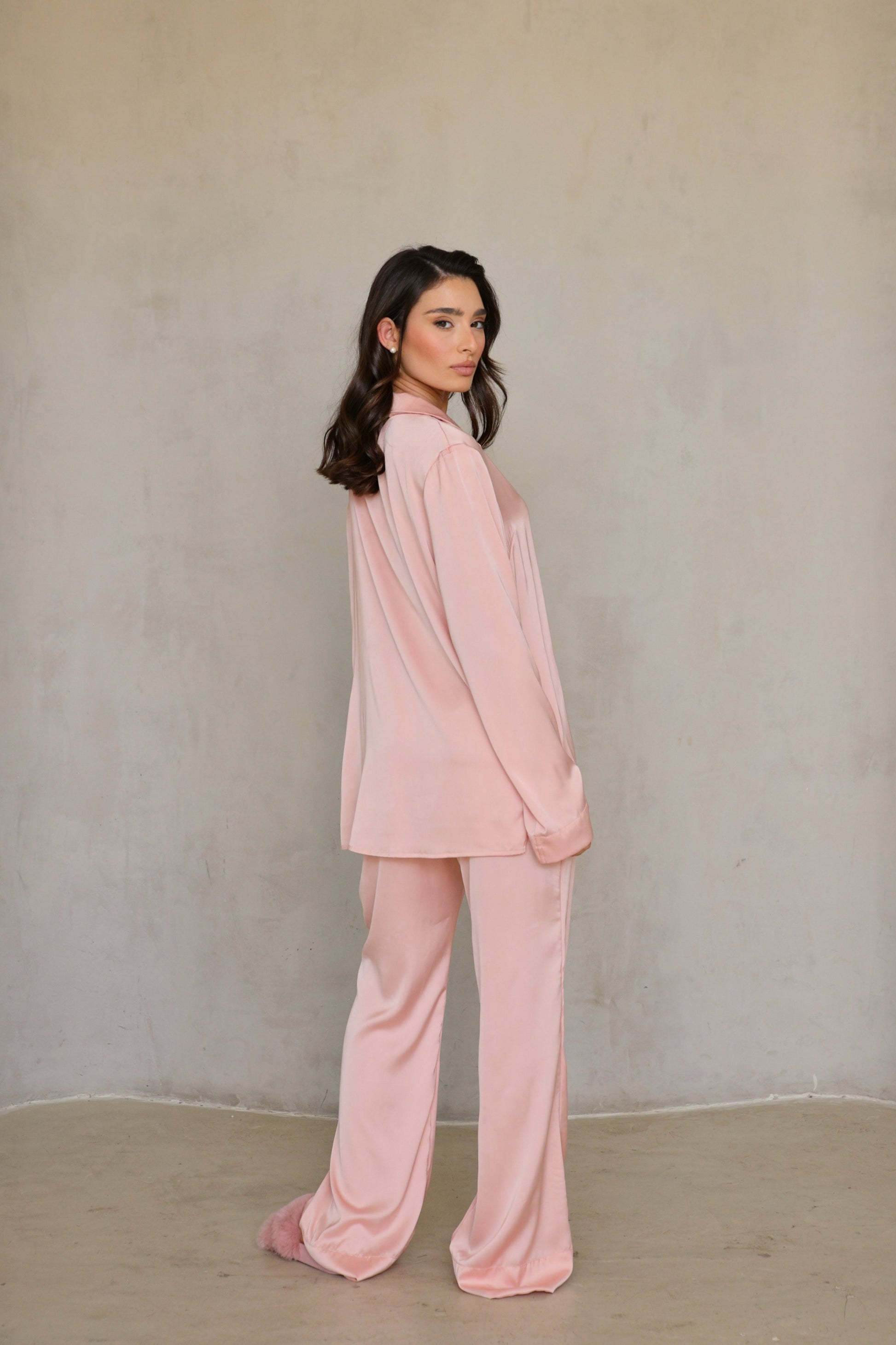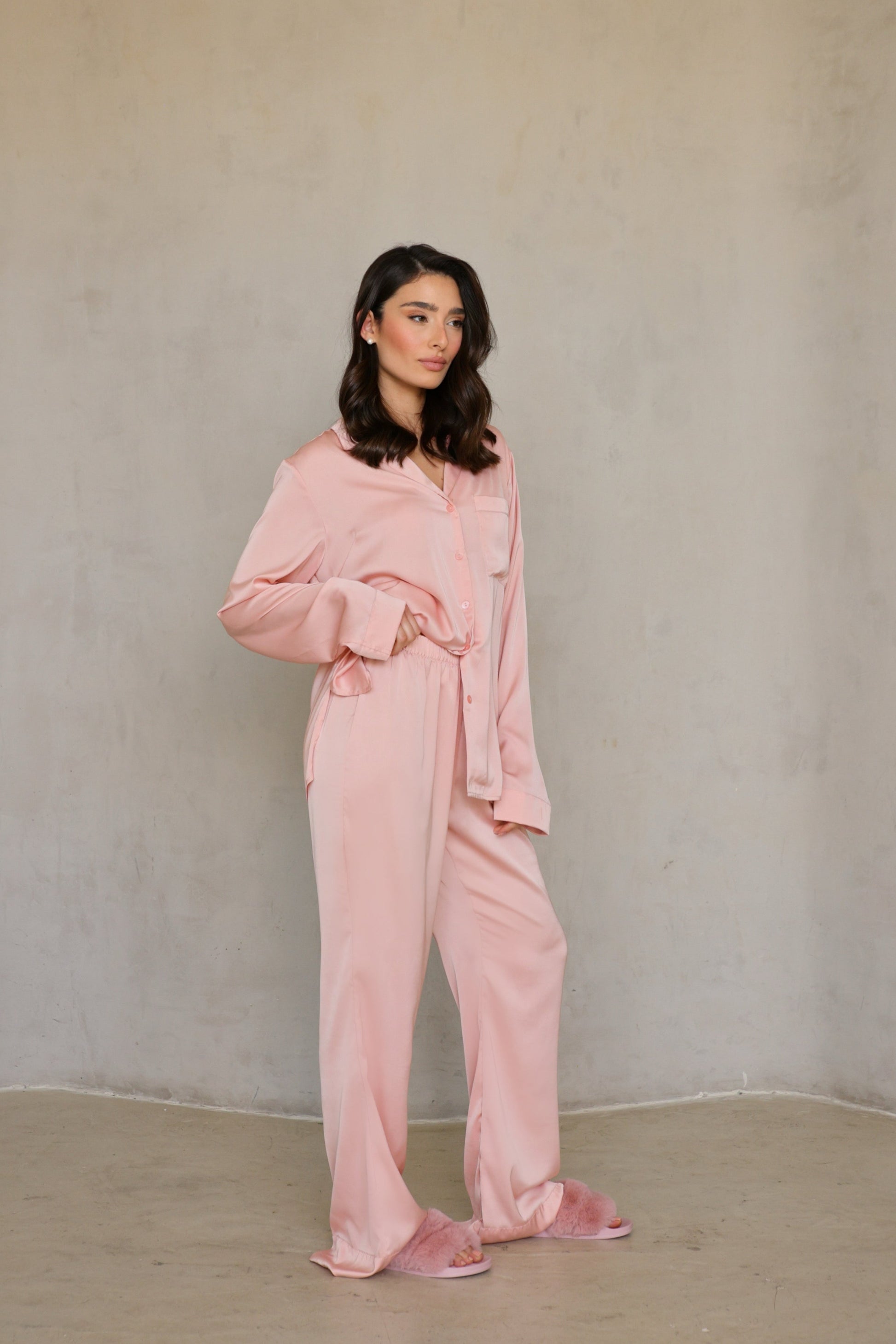 סט פיג’מה ארוך עשוי סאטן סמי- משי נשפך ומבריק בגוון ורוד עתיק, המעניק מראה אלגנטי ונוחות מושלמת.
